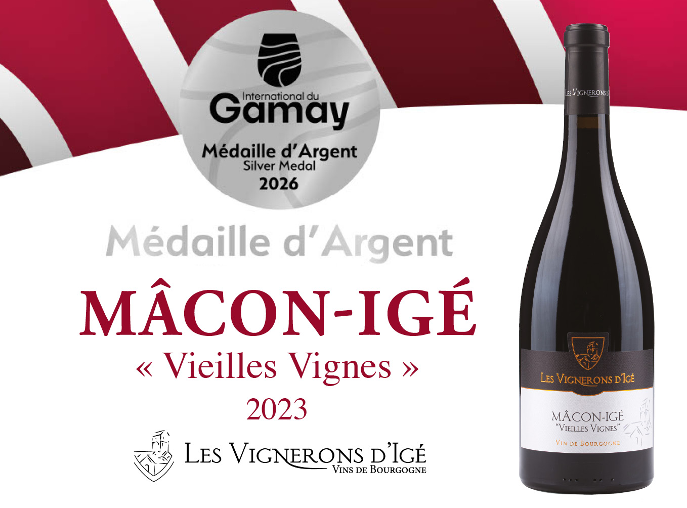 Notre vin Mâcon-Igé Rouge « Vieilles Vignes » 2023 a été récompensé par une médaille d’argent lors du Concours International du Gamay à Lyon, parmi plus de 600 vins dégustés.